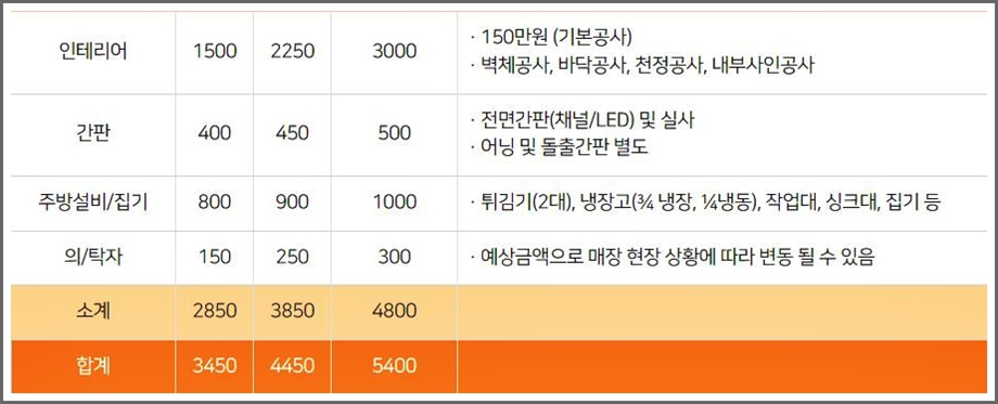창업비용은 20평 기준 총 5천4백만 원 + 가계 전세보증금 => 이렇게 필요합니다.