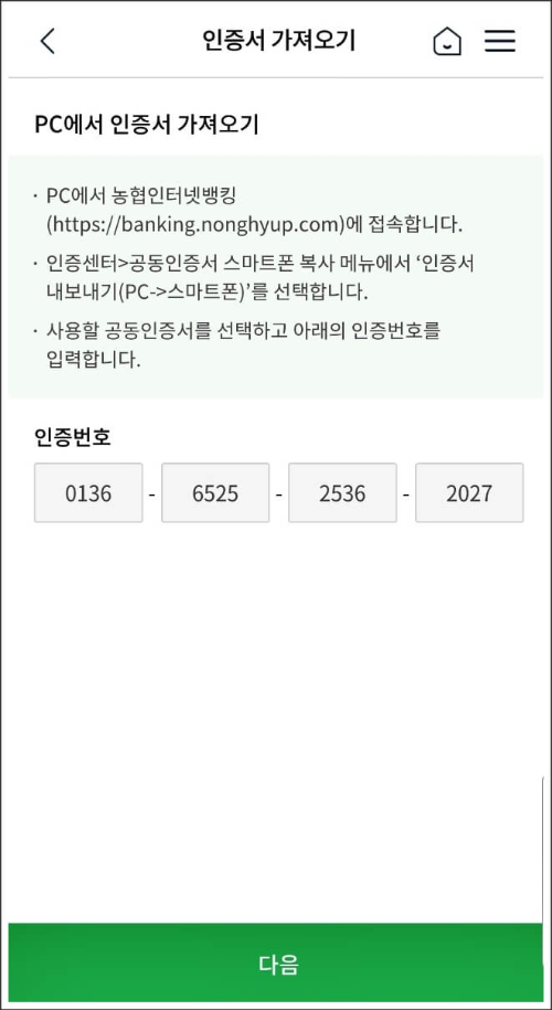 위의 화면은 농협은행의 '인증센터' 화면입니다. 은행마다 화면이 조금 다를 수 있습니다.