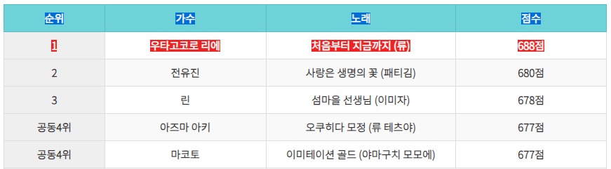 | 한일가왕전 1라운드 결과, 자체탐색전 1위, 점수배점방식, 출연, 노래 (0) | 2024.04.15 |
