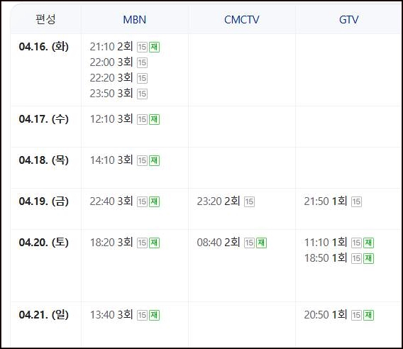MBN, CMCTV, GTV에서 위의 방송시간대에 재방송 시청이 가능하며 K-star, MBN플러스에서도 재방송을 해 줍니다.