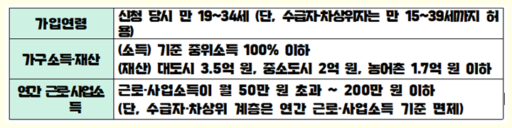 - 신청 후 소득조사 결과 기준 중위소득 50%를 초과했을 때에는 연령기준(만19세~34세)