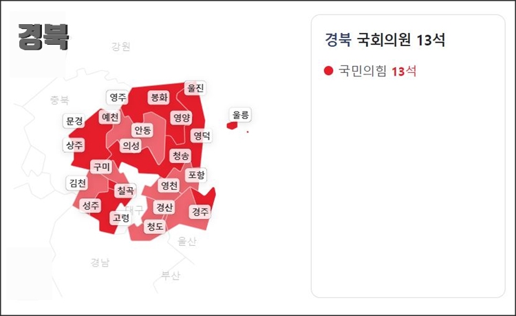 - 경북지역은 모든 의석수를 국민의 힘이 차지하였습니다.